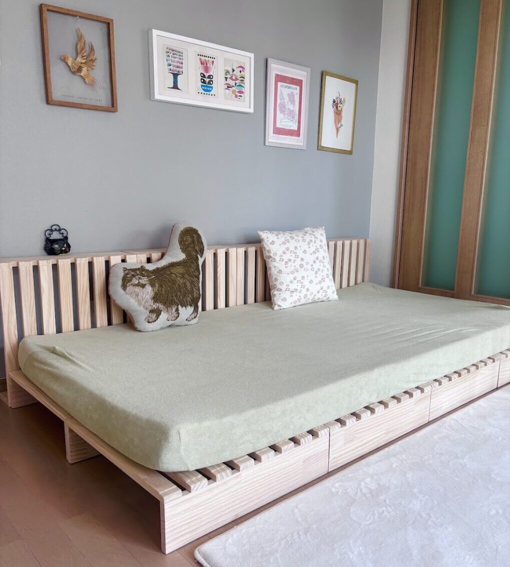 数年間は布団生活を続けていましたが、最近は身軽に暮らしたい人向けのアイデア商品が次々と出てきています。今は「パレットベッド」と、折りたためて軽いマットレスを取り入れていますが、扱いやすさと気軽さのバランスがちょうどいいと感じています。