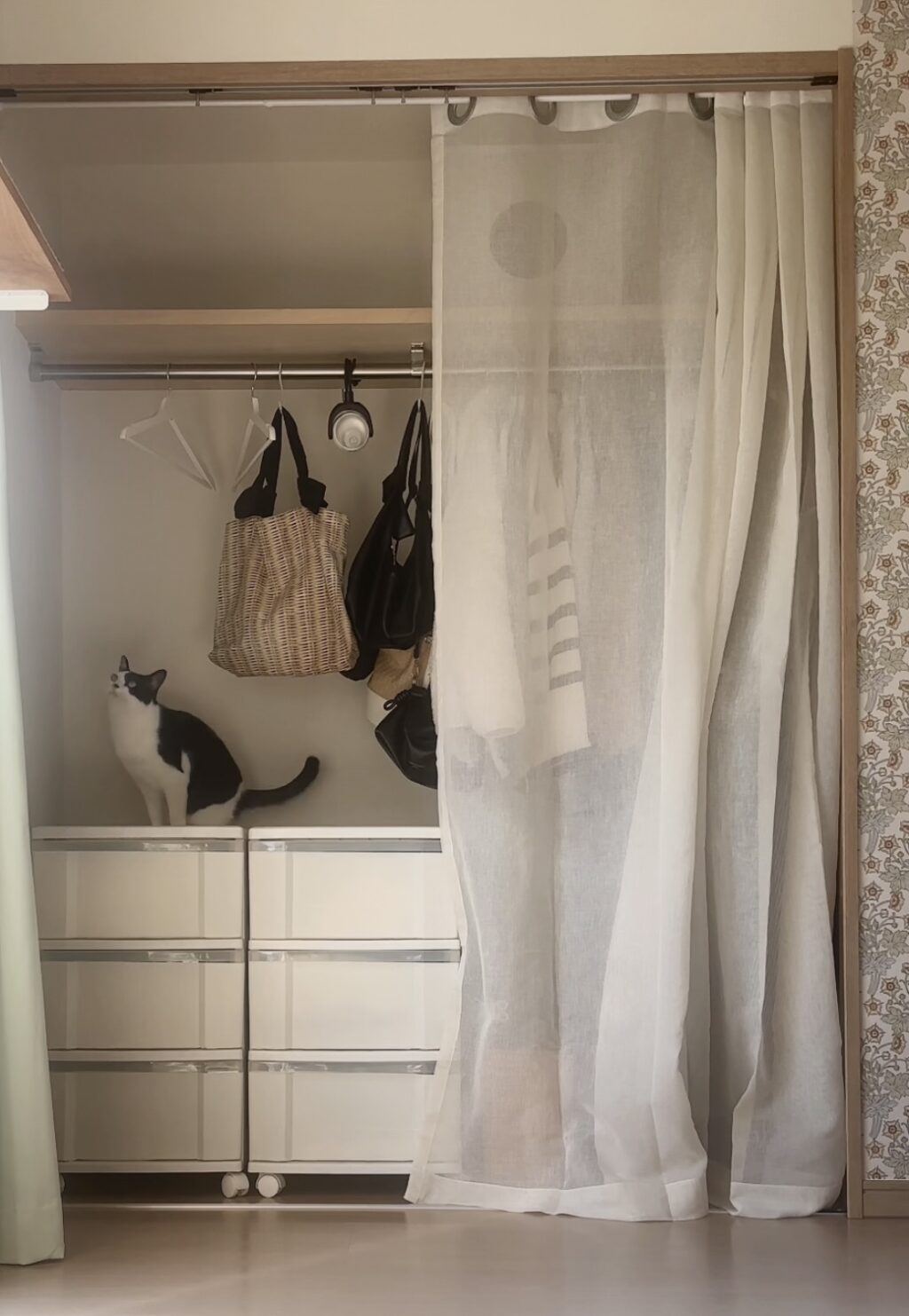 わが家では、クローゼット上のスペースを猫に譲り、窓辺のキャットウォークからつながるように動線を整えました。ついにはクローゼットの折れ戸も外して、いつでも自由に上り下りできるようにしています。