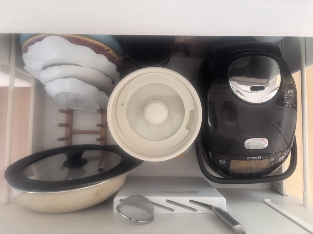 それらを少しずつ手放していったことで、空いたビルトインスペースには炊飯器やゴミ箱などを収納できるようになり、生活感が減ってキッチンが快適になりました。