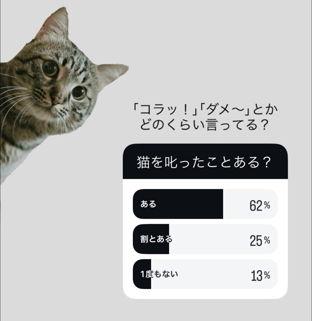 実際に行ったアンケートでは、「猫を叱ったことがある」と答えた方はなんと約90%。