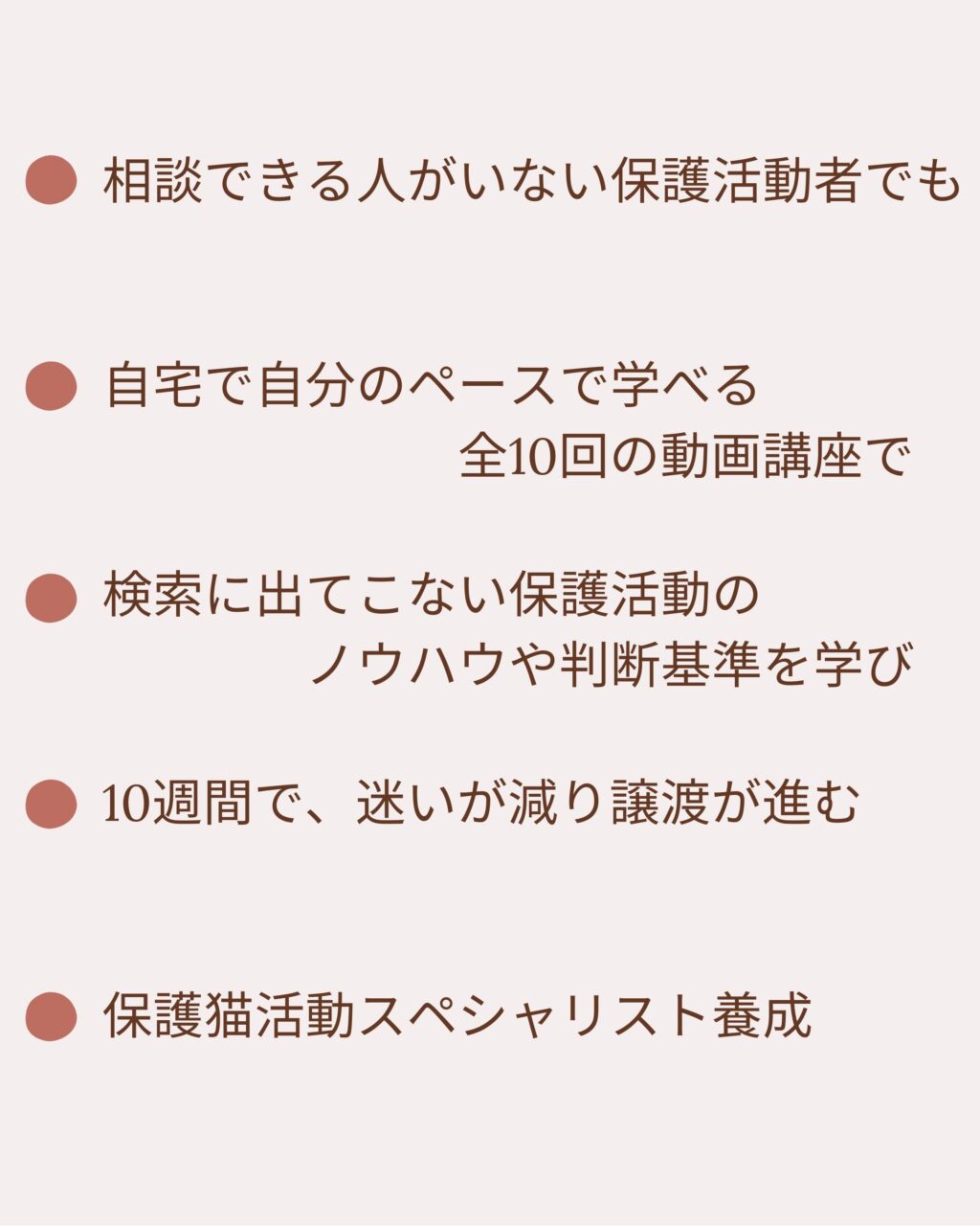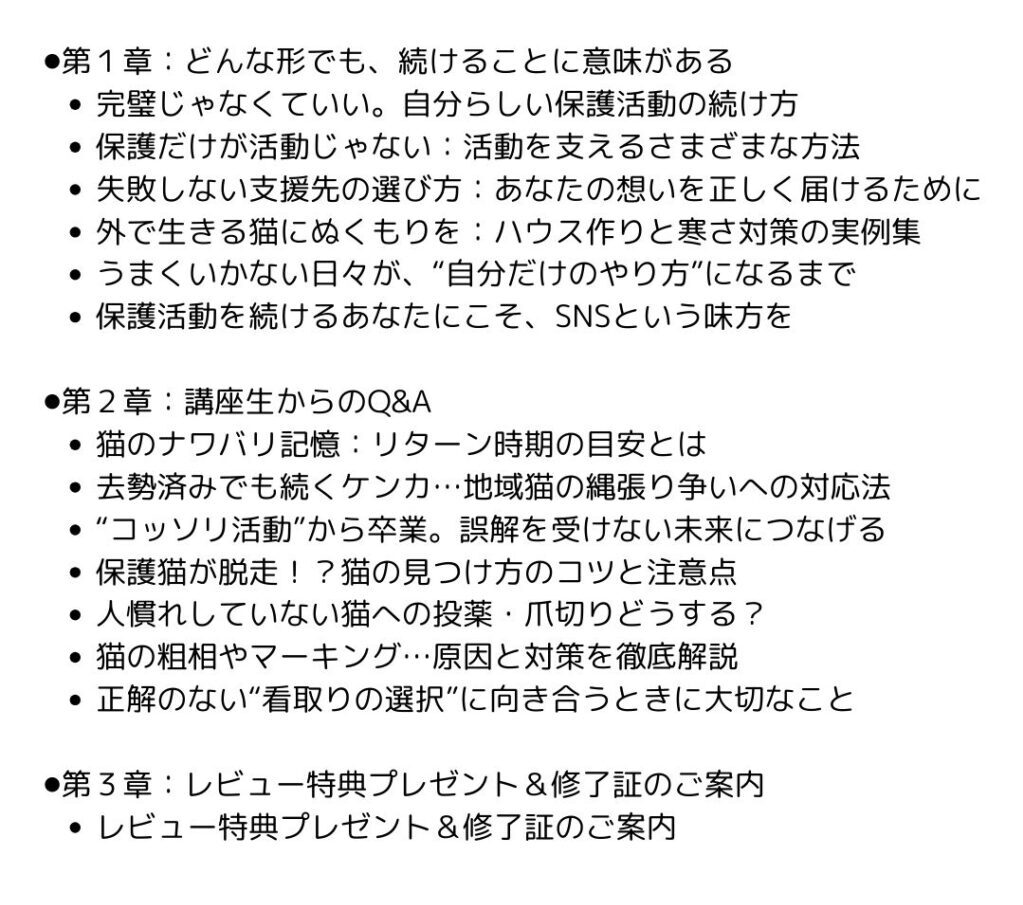 「保護猫活動を学べる講座」として、ここまで網羅的に、かつ個人向けに設計された内容は、現時点では他に見当たりません。